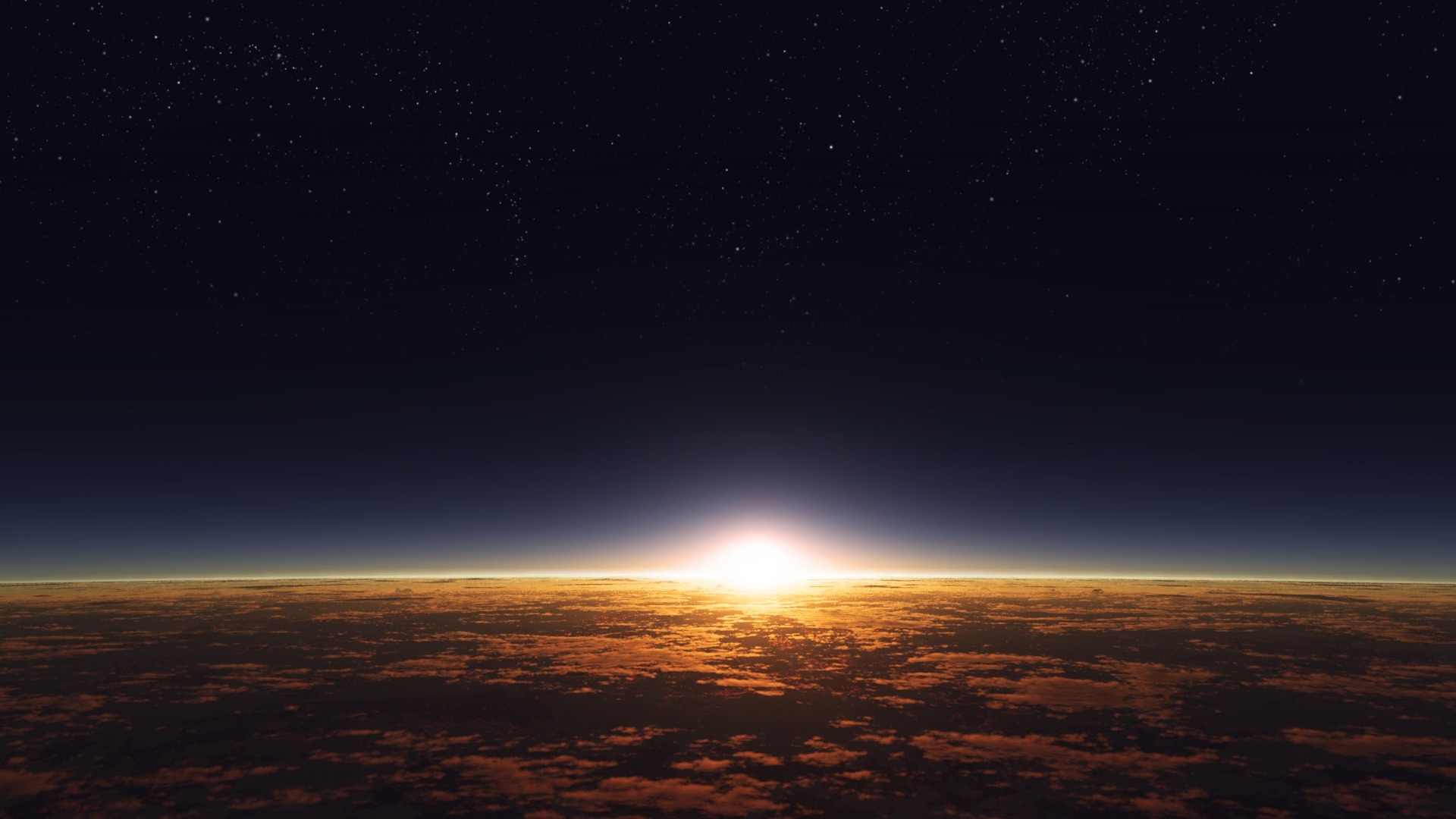 Description: A bright sun shines brightly over the horizon of a large body of water in the distance.