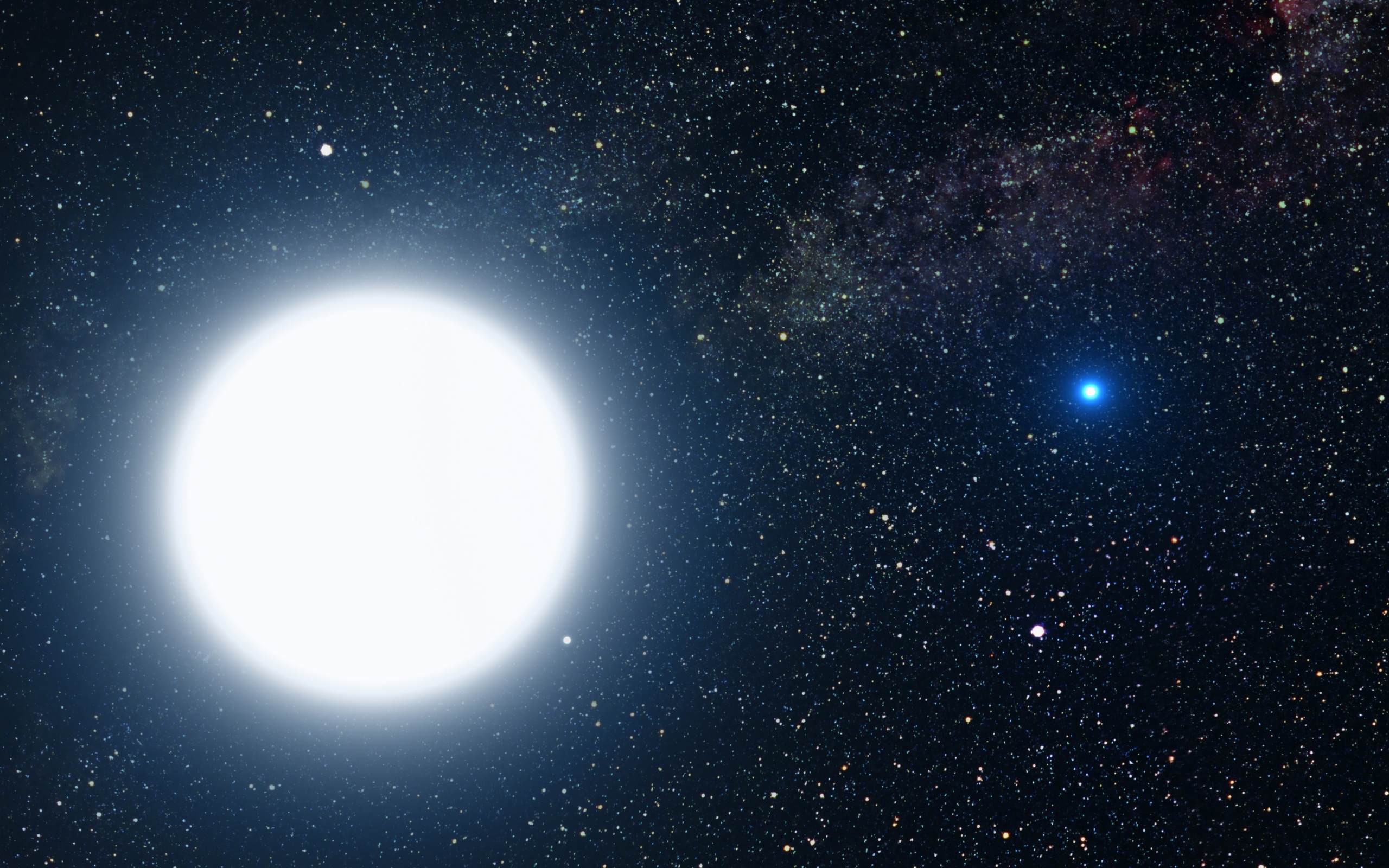 Description: A bright white object in the middle of a dark sky with stars around it and a bright blue object in the middle of the sky.