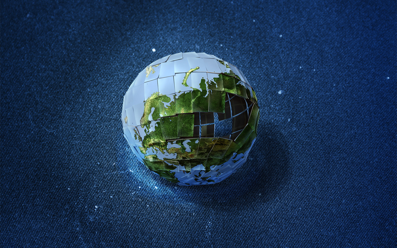 Description: A broken globe on a blue surface with a reflection of the earth in it's surface and a blue background.