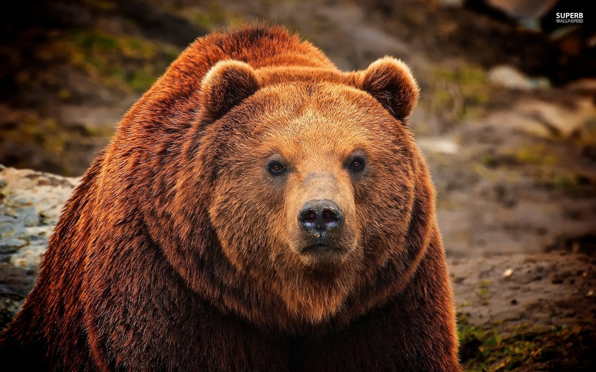 Description: A brown bear standing on top of a dirt field next to a forest filled with trees and grass and rocks.