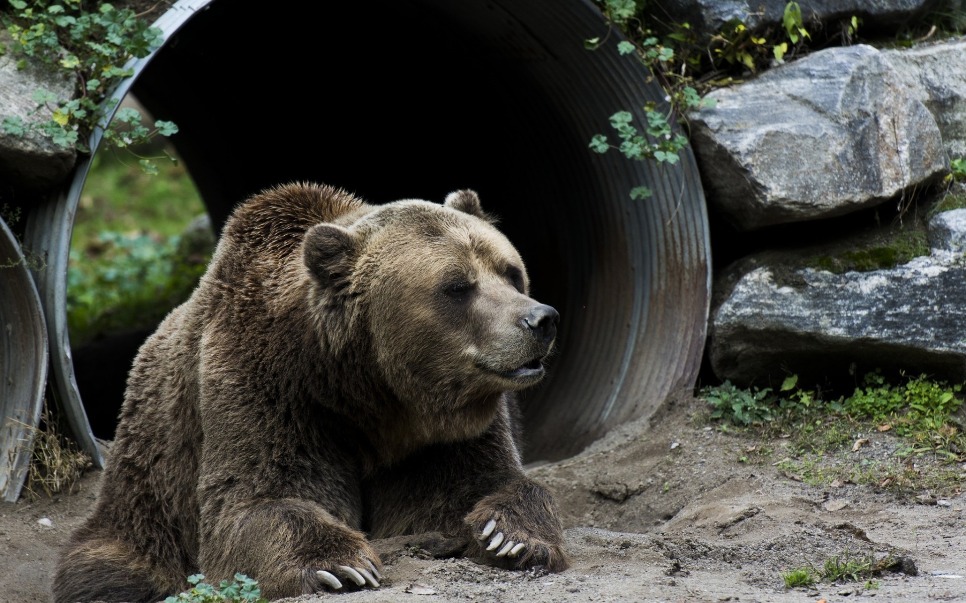 Description: A brown bear sitting in front of a large pipe in a forest area with rocks and grass around it.