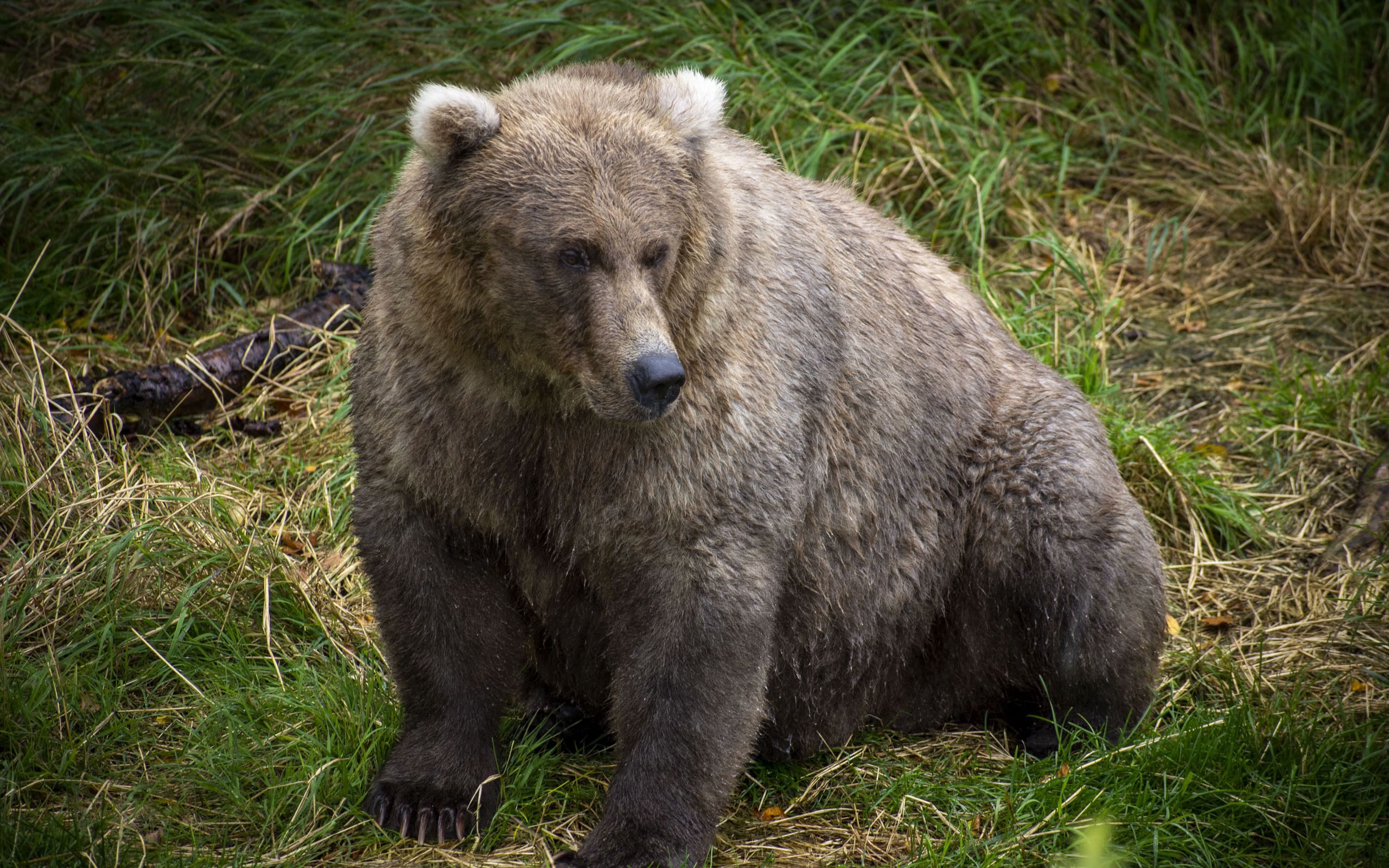Description: A brown bear sitting in the grass with a log in the background and a log in the foreground.
