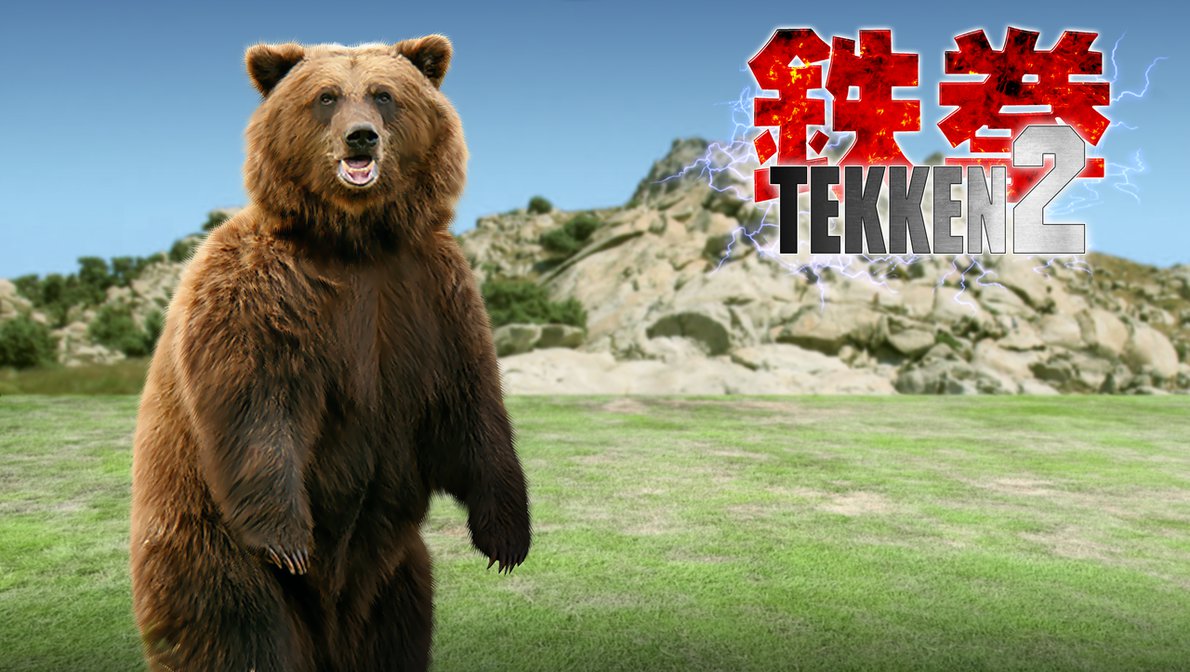 Description: A brown bear standing on its hind legs in a field with a mountain in the background and a red and white sign that says tekken.
