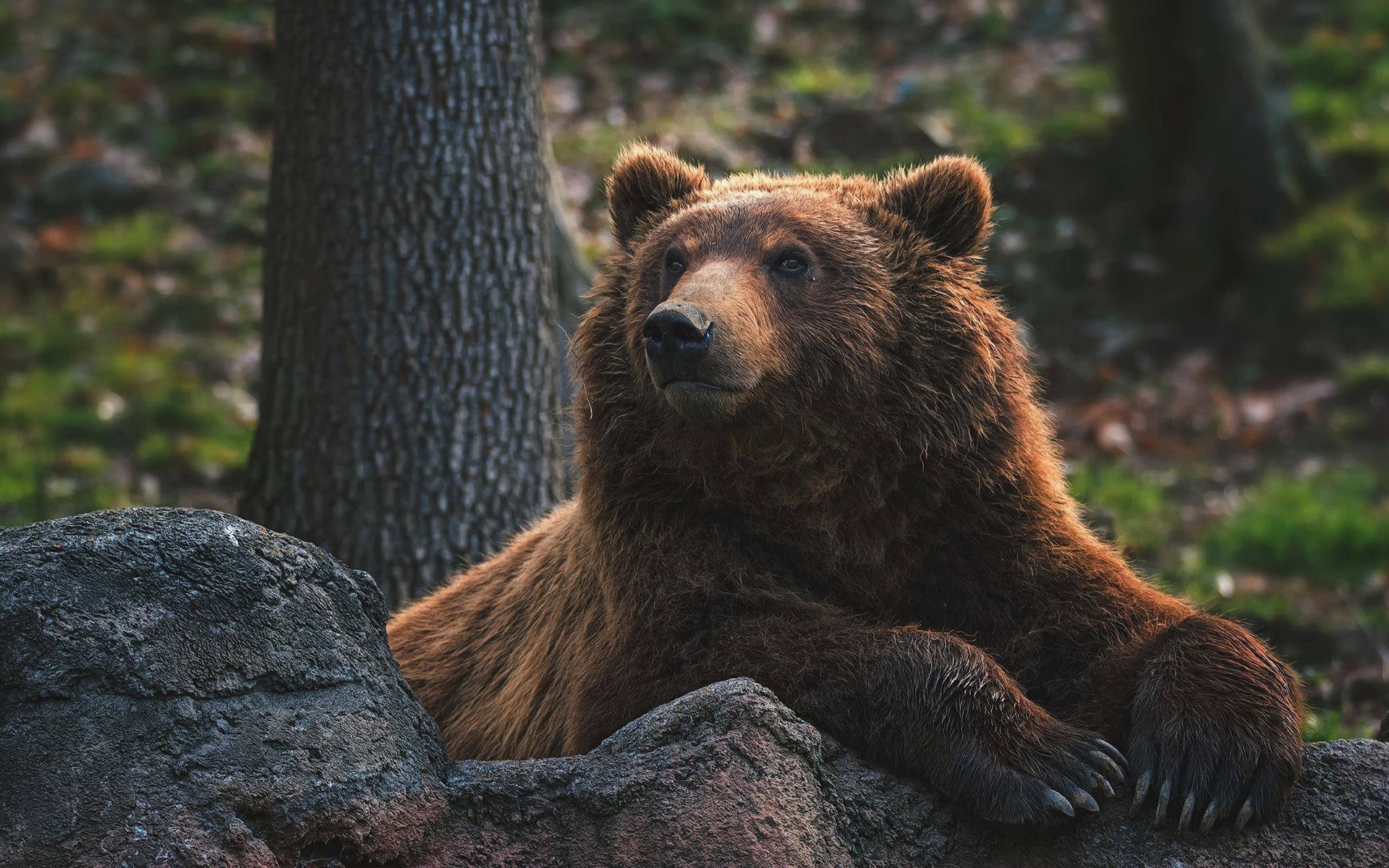 Description: A brown bear sitting on top of a rock next to a tree and a rock wall with a tree in the background.