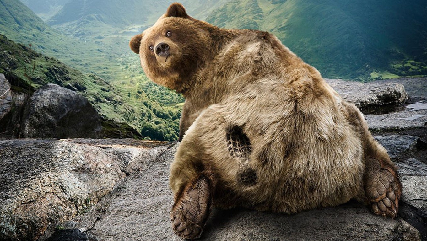 Description: A brown bear sitting on top of a rock covered in grass and rocks with mountains in the background and a sky.