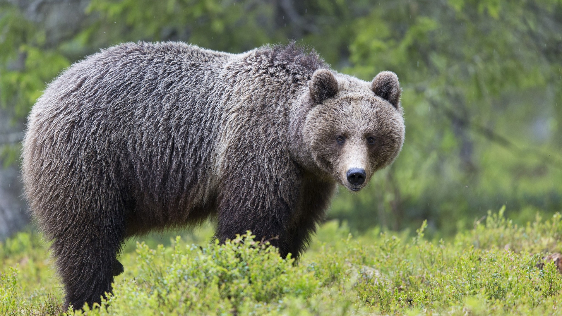Description: A large brown bear standing on top of a lush green field next to trees and bushes on a sunny day.