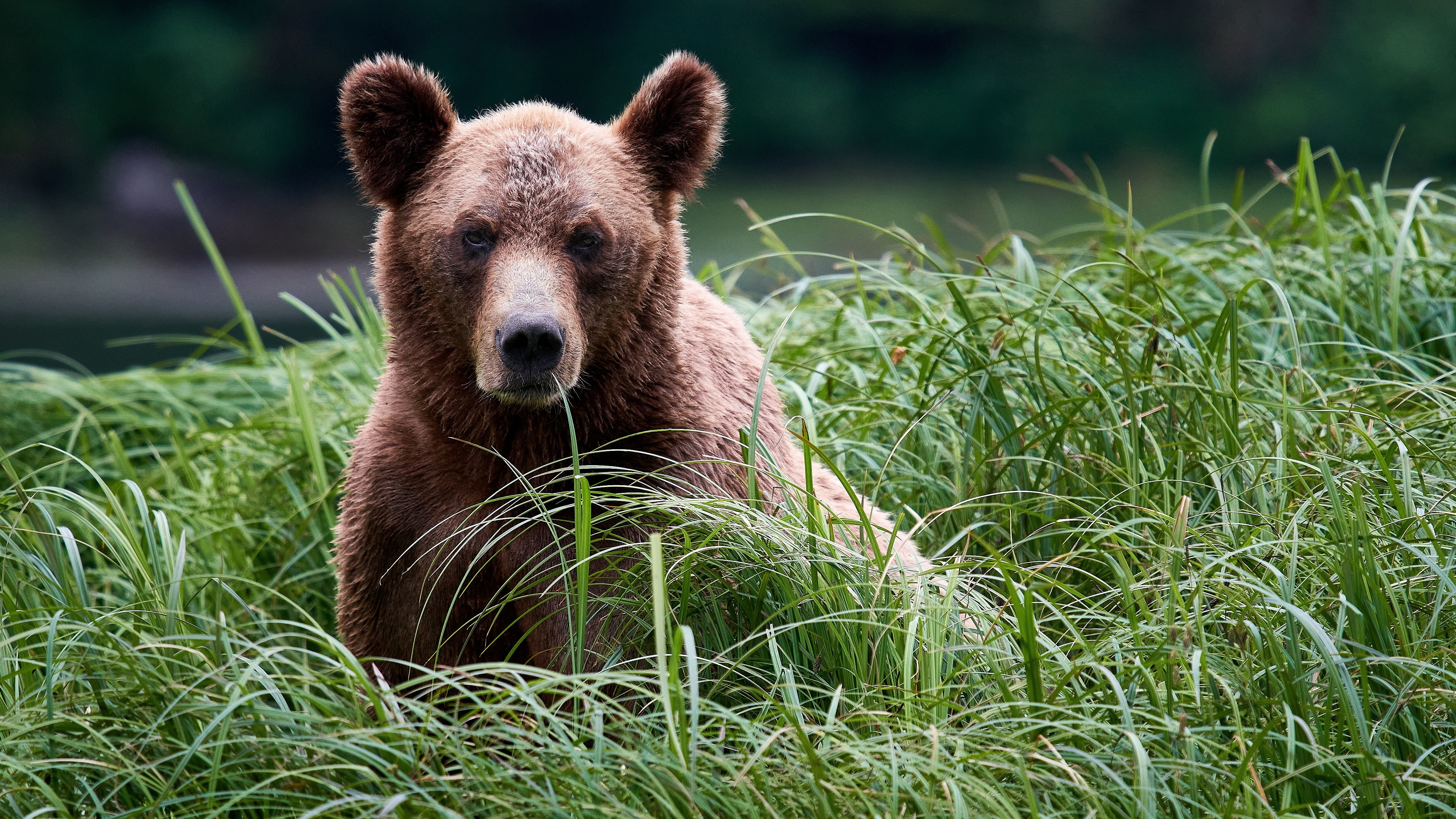 Description: A brown bear is sitting in tall grass and looking at the camera with a sad look on his face.
