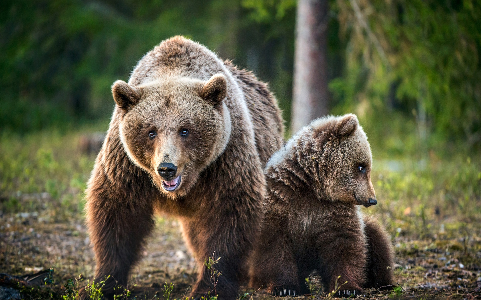 Description: A couple of brown bears standing next to each other on a forest floor with trees in the background and grass in the foreground.