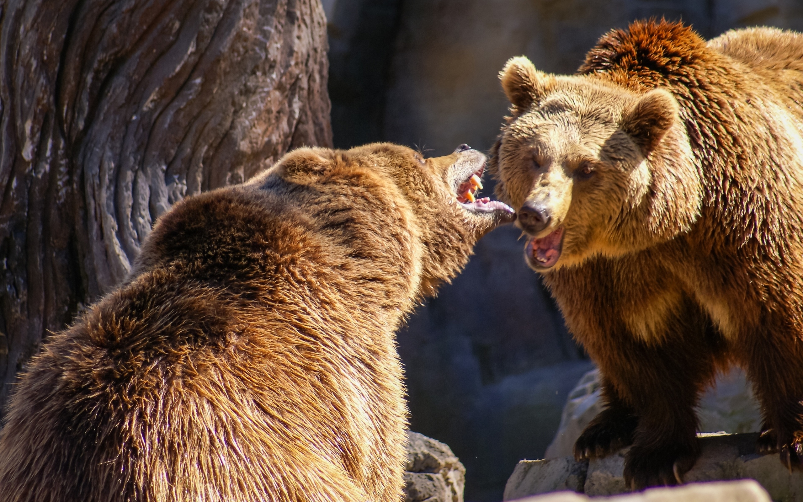 Description: Two brown bears are standing next to each other and one is biting the other bear's teeth with its mouth.