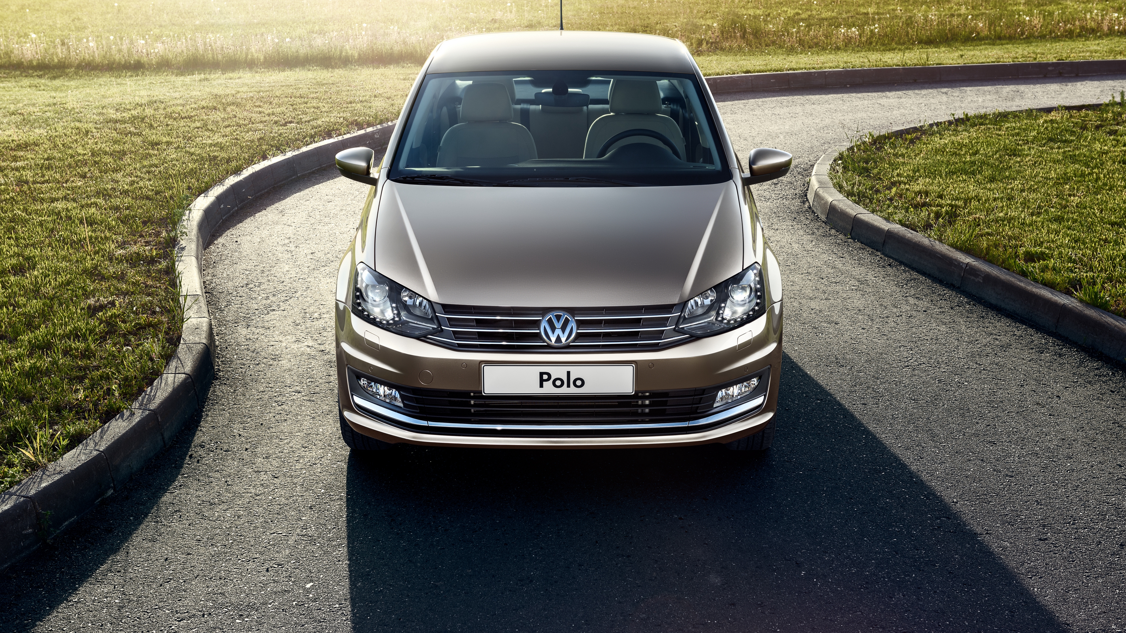 Description: A brown car driving down a winding road next to a lush green field of grass and a field of flowers.