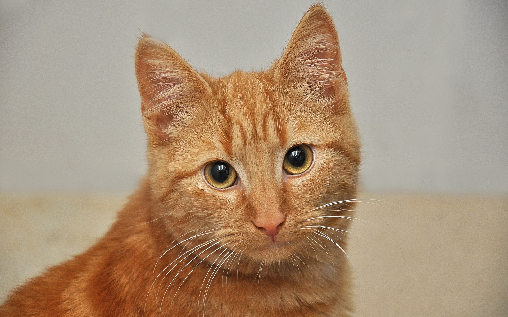 Description: A close up of a cat with a white background and a brown cat with a black nose and a white wall.