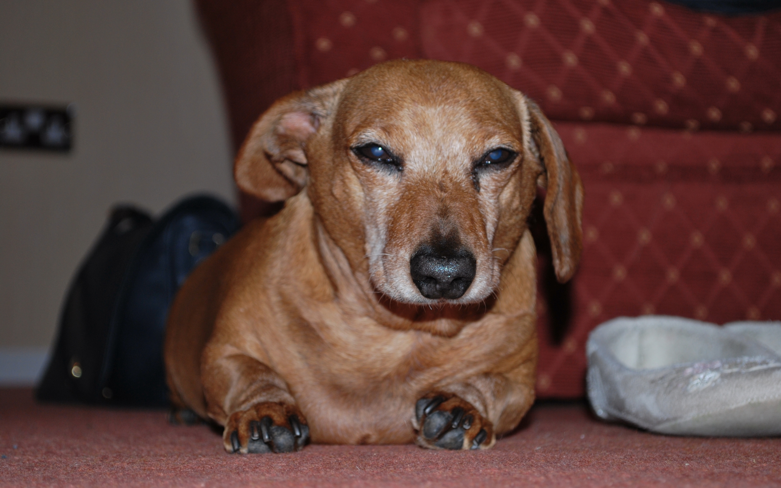 Description: A brown dog sitting on the floor next to a bag of clothes and a handbag on the floor.
