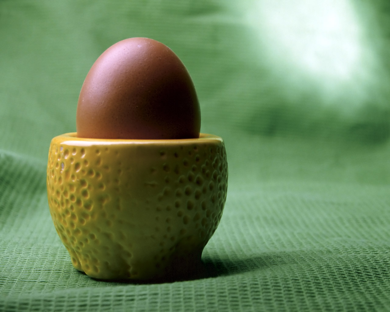 Description: A brown egg in a yellow cup on a green cloth background with a soft shadow of the egg in the cup.