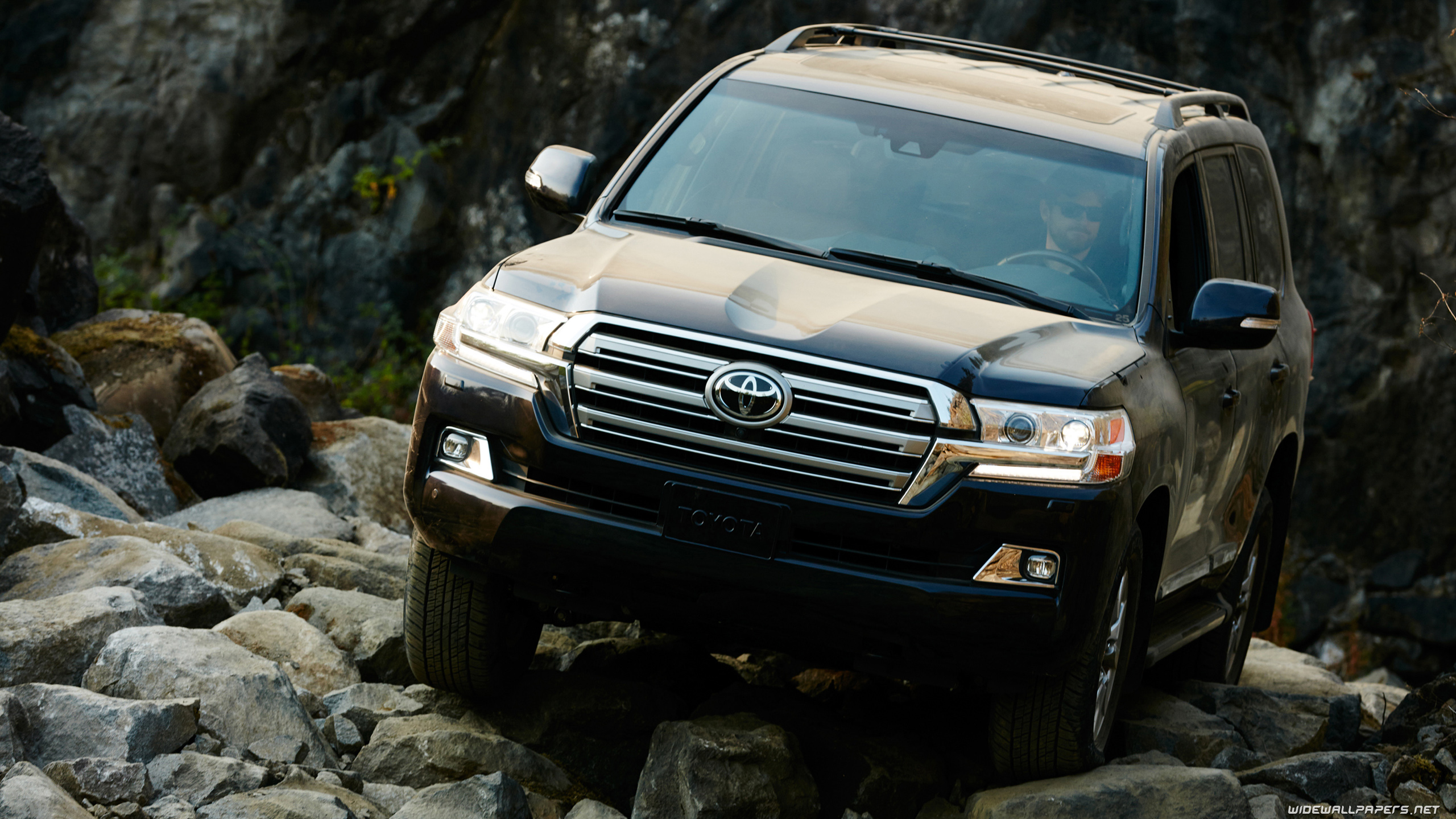 Description: A brown suv is driving on rocks near a mountain side area with a rock wall in the background and a rock wall in the foreground.