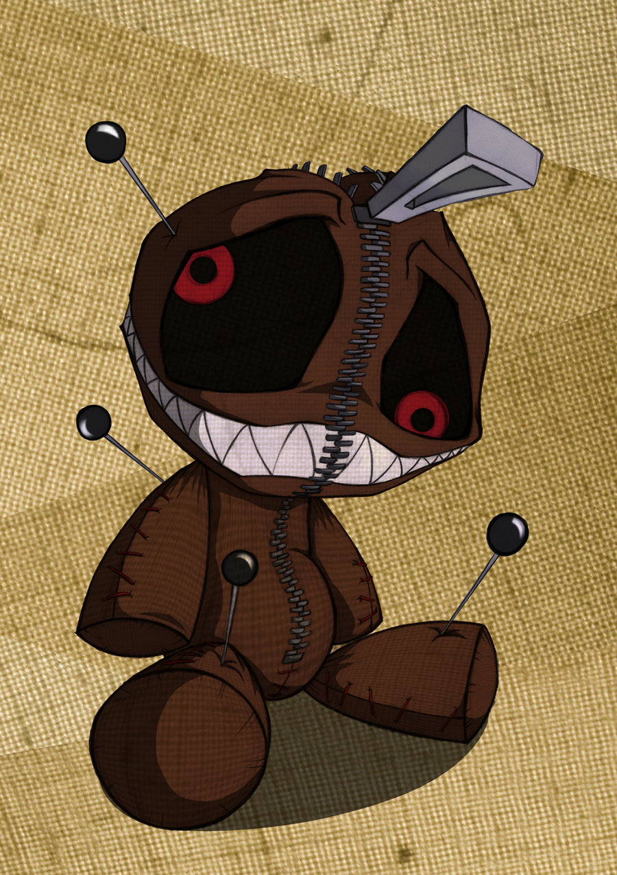 Description: A brown teddy bear with a knife in its mouth and a cord in its mouth.