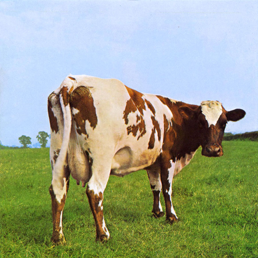 Description: A brown and white cow standing in a field of grass with a sky background and a few clouds in the distance.