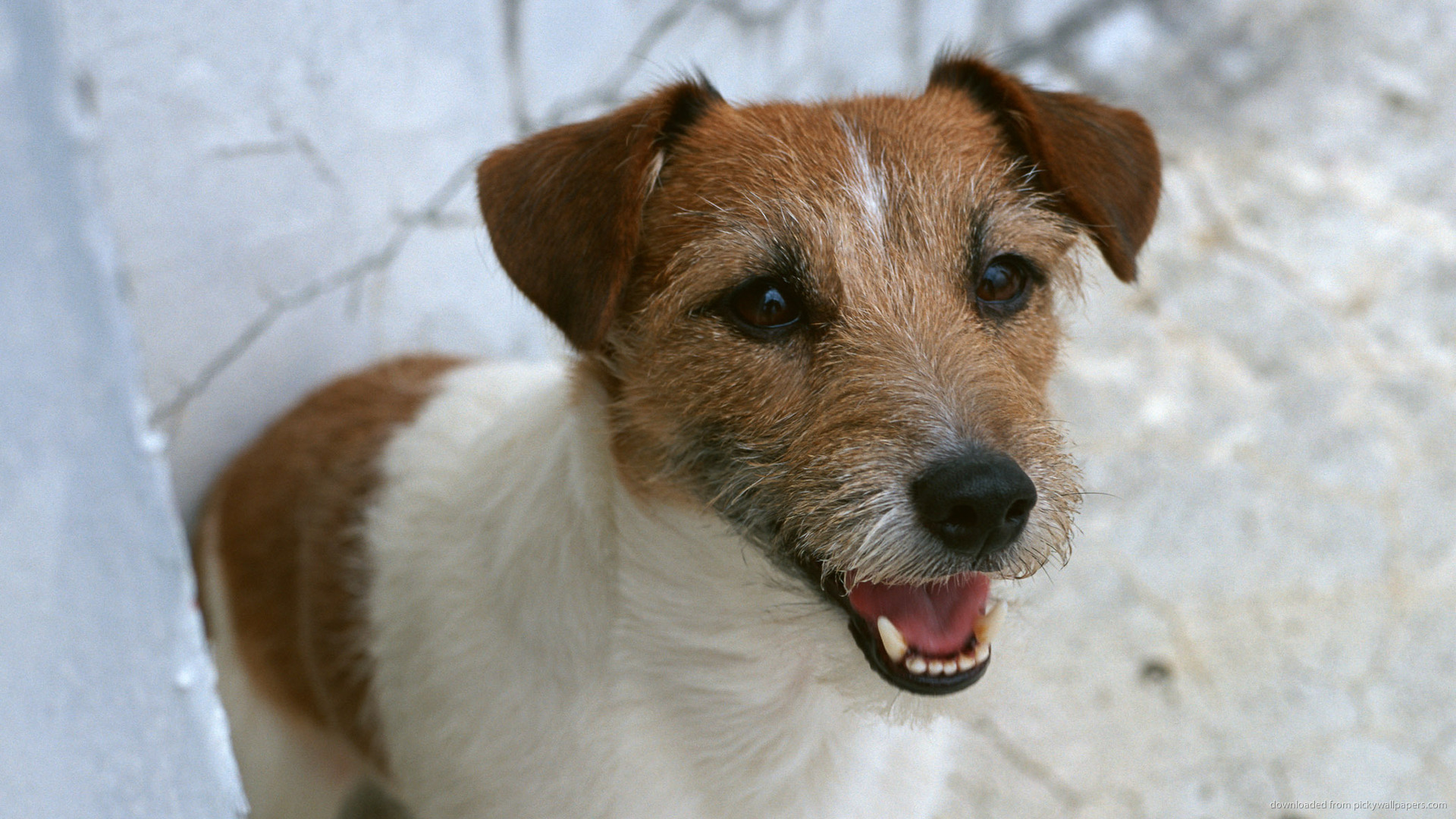Description: A brown and white dog with a white wall in the background and a white wall in the foreground.