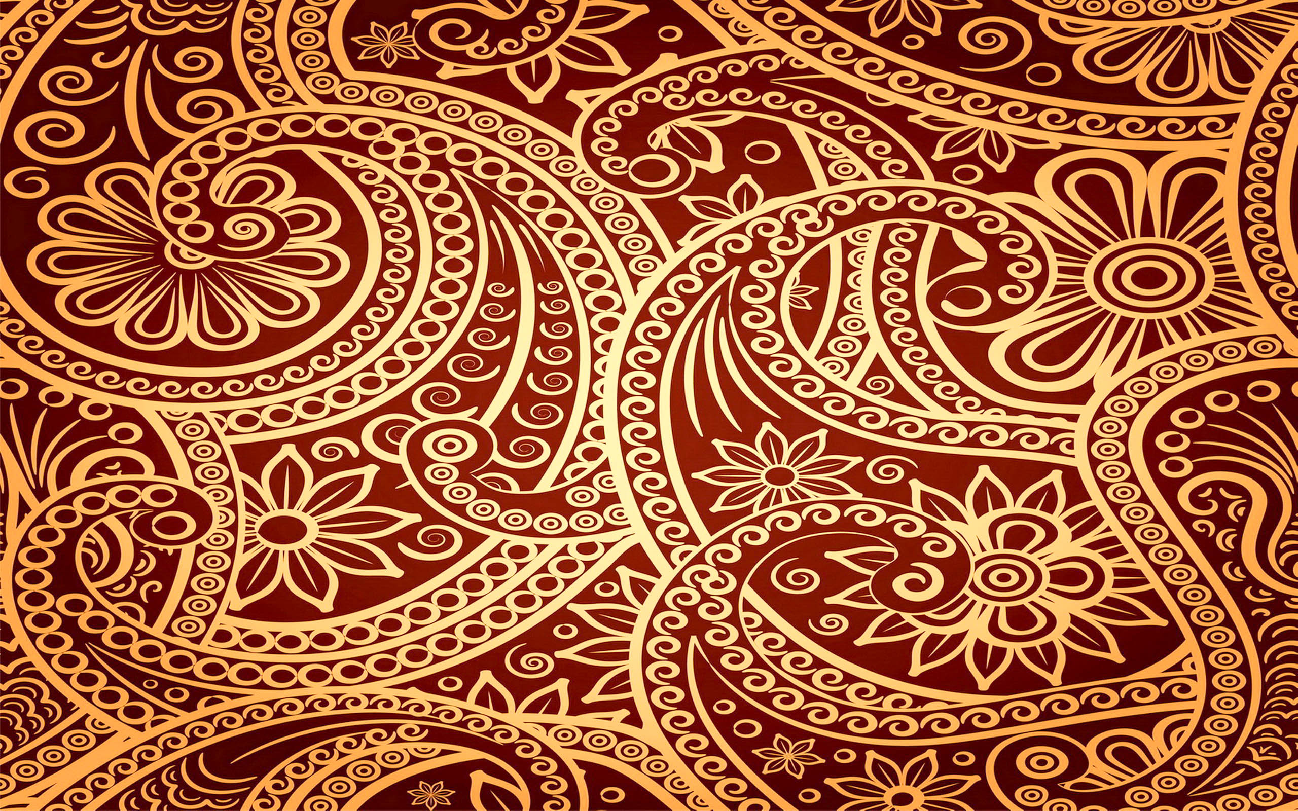 Description: A brown and yellow paisley pattern with a red background and a gold border on the bottom of the image.
