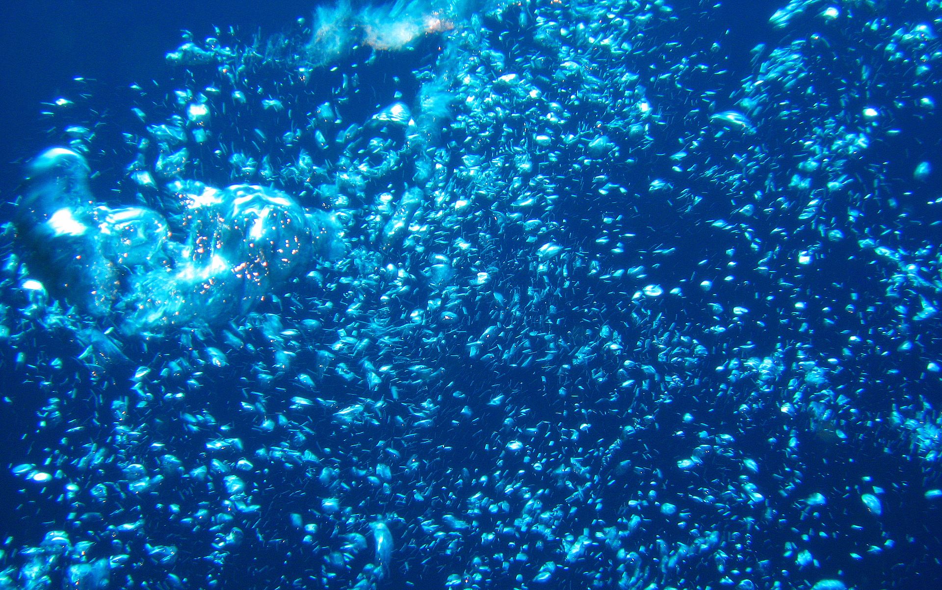 Description: A large amount of bubbles floating in the water on a sunny day.