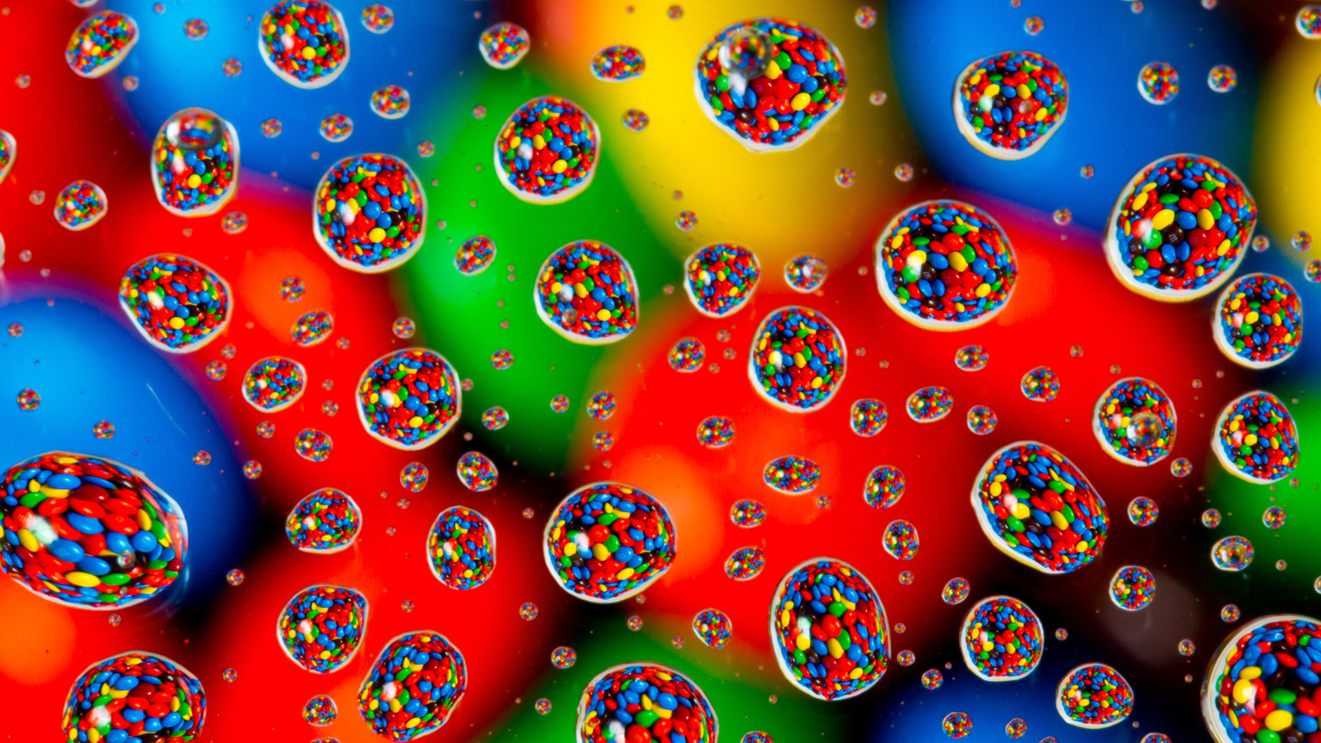 Description: A bunch of bubbles that are on a window pane with water droplets on them and a rainbow background.