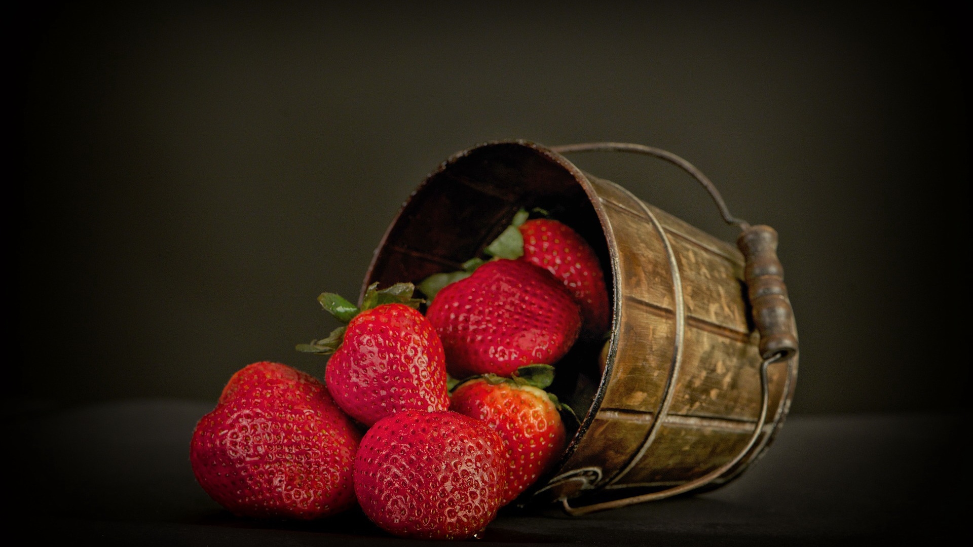 Description: A bucket of strawberries is sitting on a table with a black background and a brown tin pail.
