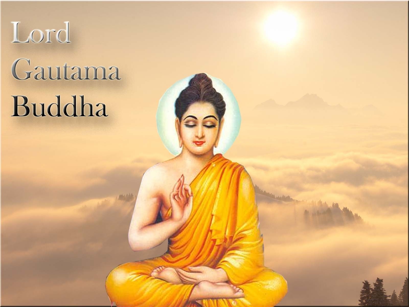 Description: A buddha statue sitting in the middle of a foggy sky with the words lord gautama buddha.