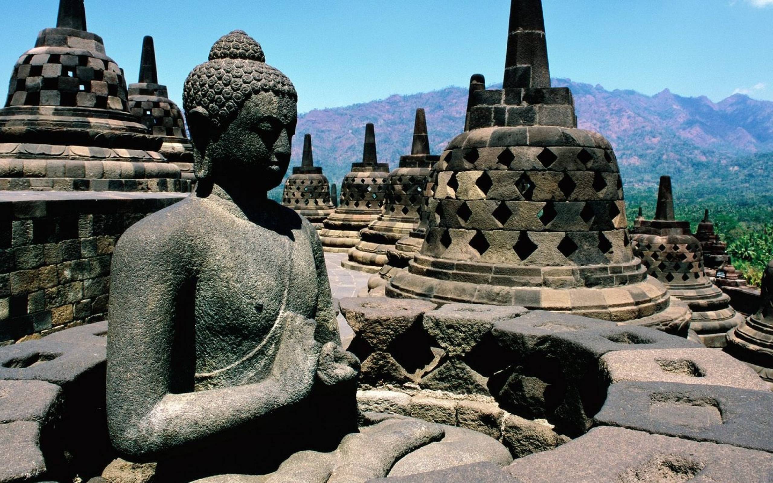Description: A statue of a buddha in a stone courtyard with mountains in the background in a city of stone structures.