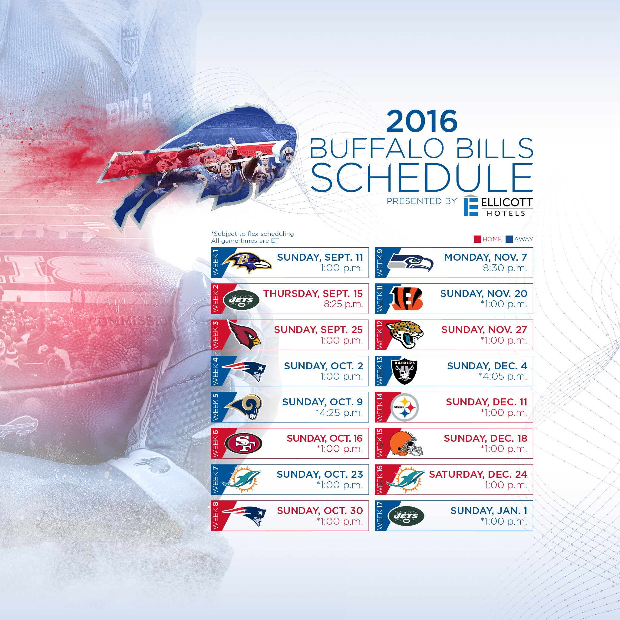 Description: A poster with a football schedule on it for buffalo bills schedules on the side of a football field.