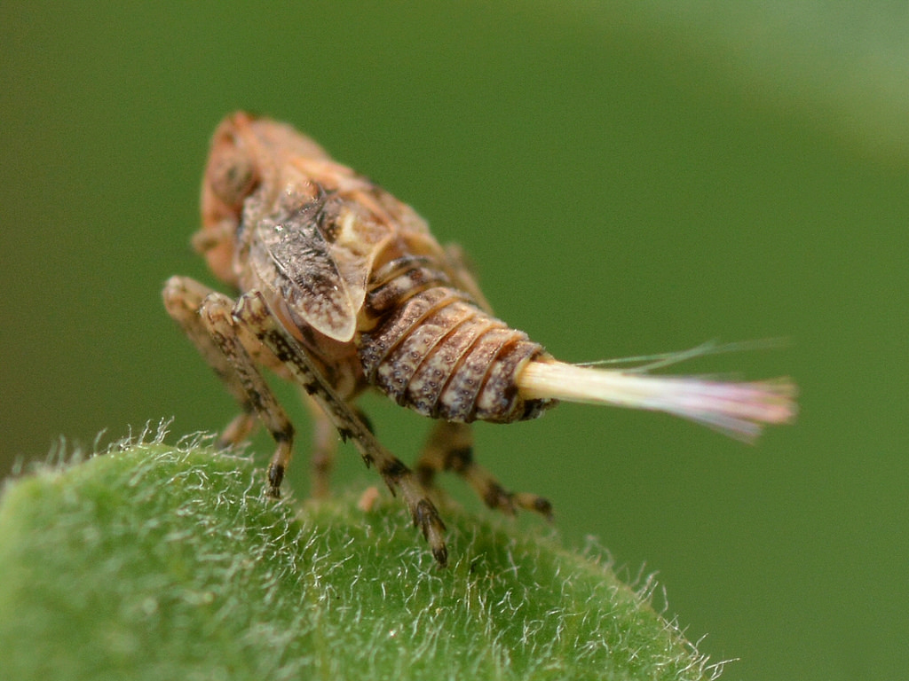 Description: A close up of a bug on a plant stem with a blurry background of grass and leaves in the background.