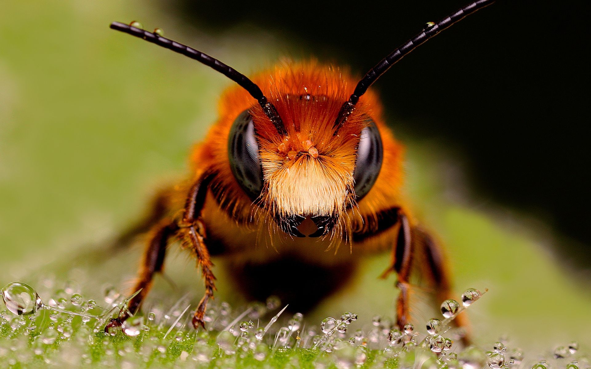 Description: A close up of a bug on a grass surface with drops of water on it's face and eyes.