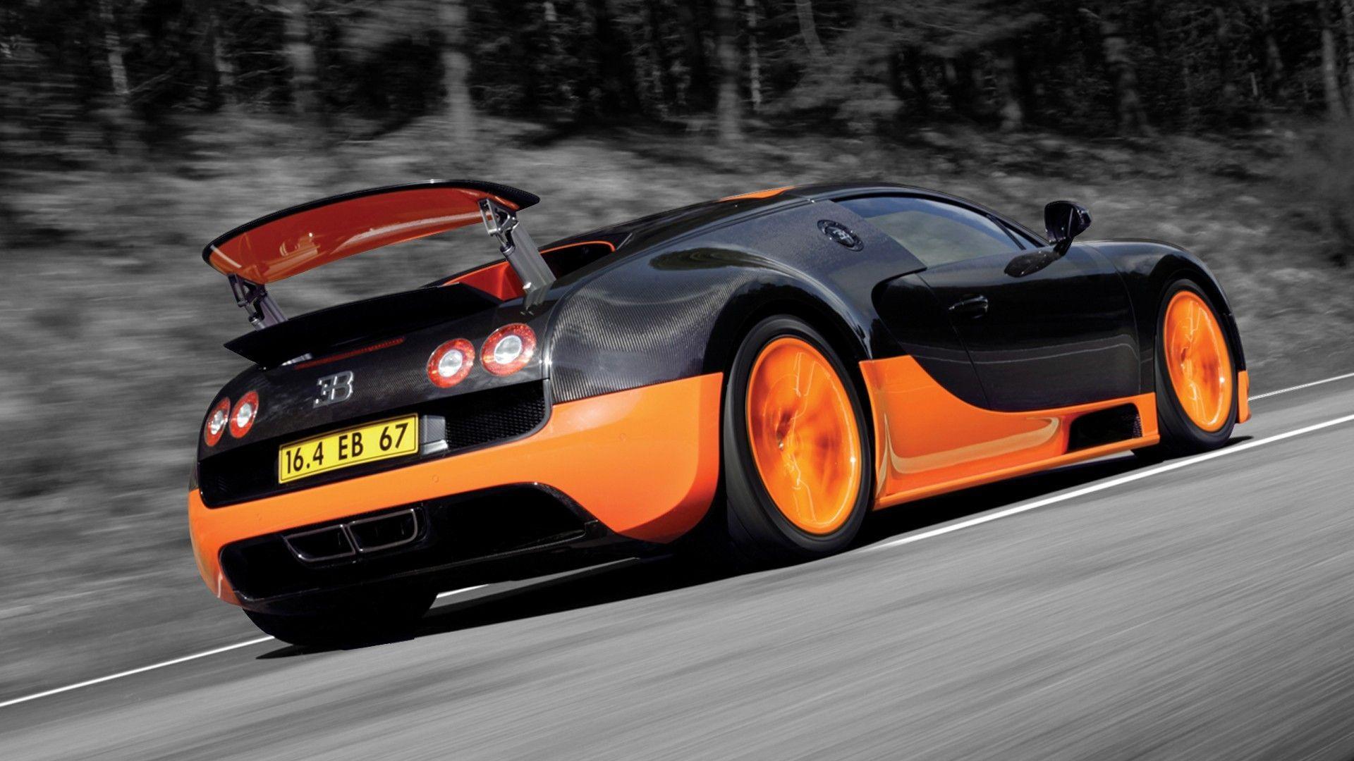 Description: A bugatti type car driving down a road in the woods with its doors open and the hood down.