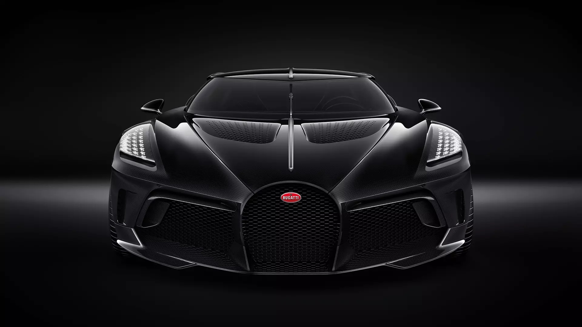 Description: A bugatti car is shown in a dark room with a black background and a red light on the hood.