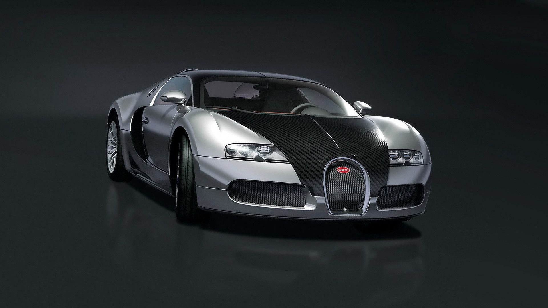 Description: A bugatti car is shown in a dark room with a black background and a reflection of the car.