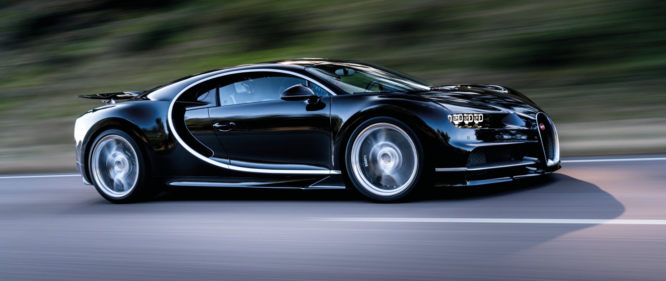 Description: A bugatti car driving down a road with blurry background and trees in the background.