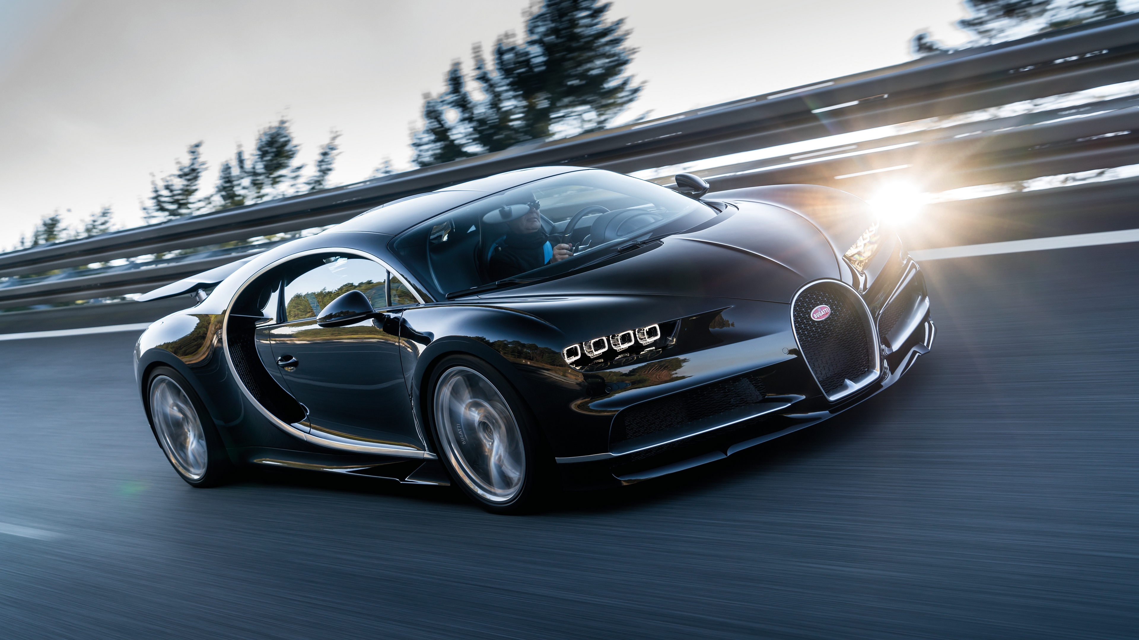 Description: A bugatti driving down a road with the sun shining on it's side and the front end of the car.