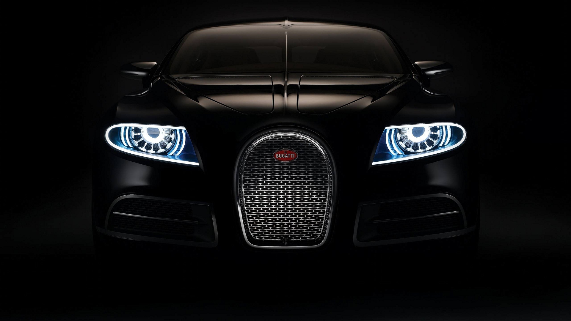 Description: A bugatti car in the dark with its headlights on and the headlights on are glowing up and the front lights are on.