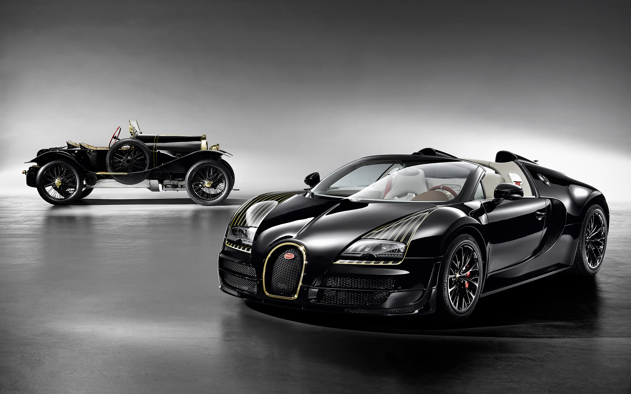 Description: A bugatti type car and a bugatti type car in a black and white photo with a spotlight.