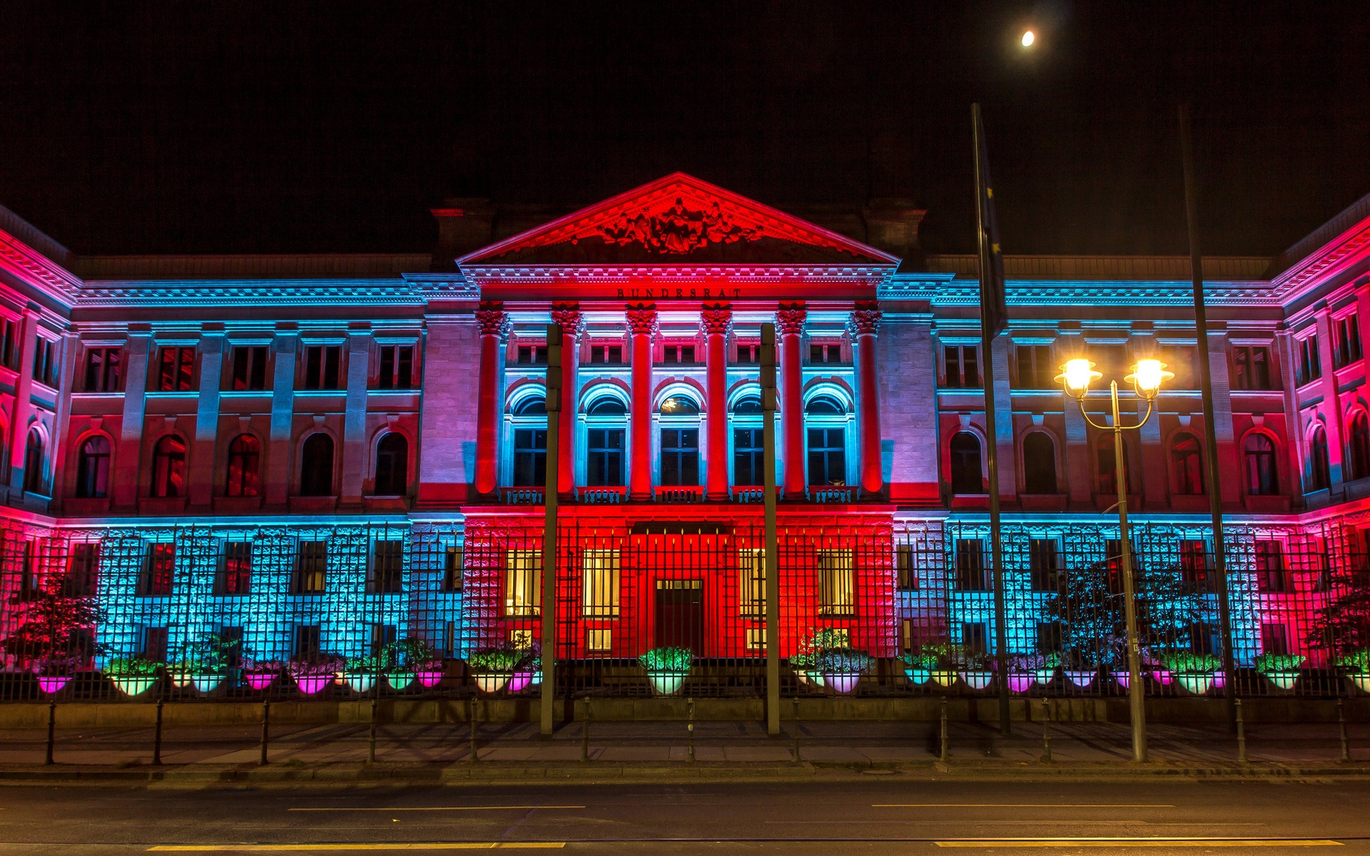 Description: A building with a red and blue light on it's side and a street light in front of it.