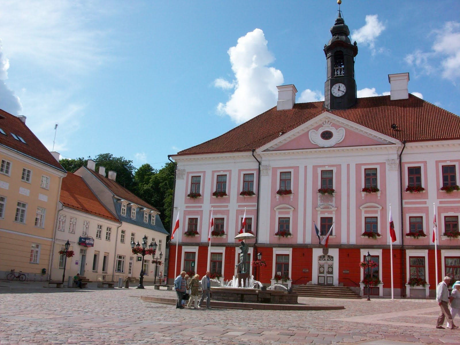 Description: A building with a clock tower on top of it's roof and a fountain in front of it.
