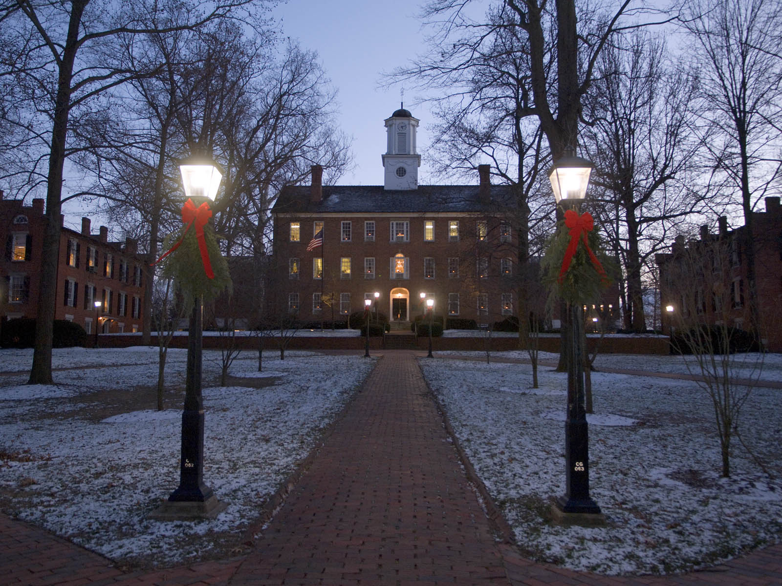 Description: A building with a clock tower and a walkway in front of it at night with lights on and snow on the ground.