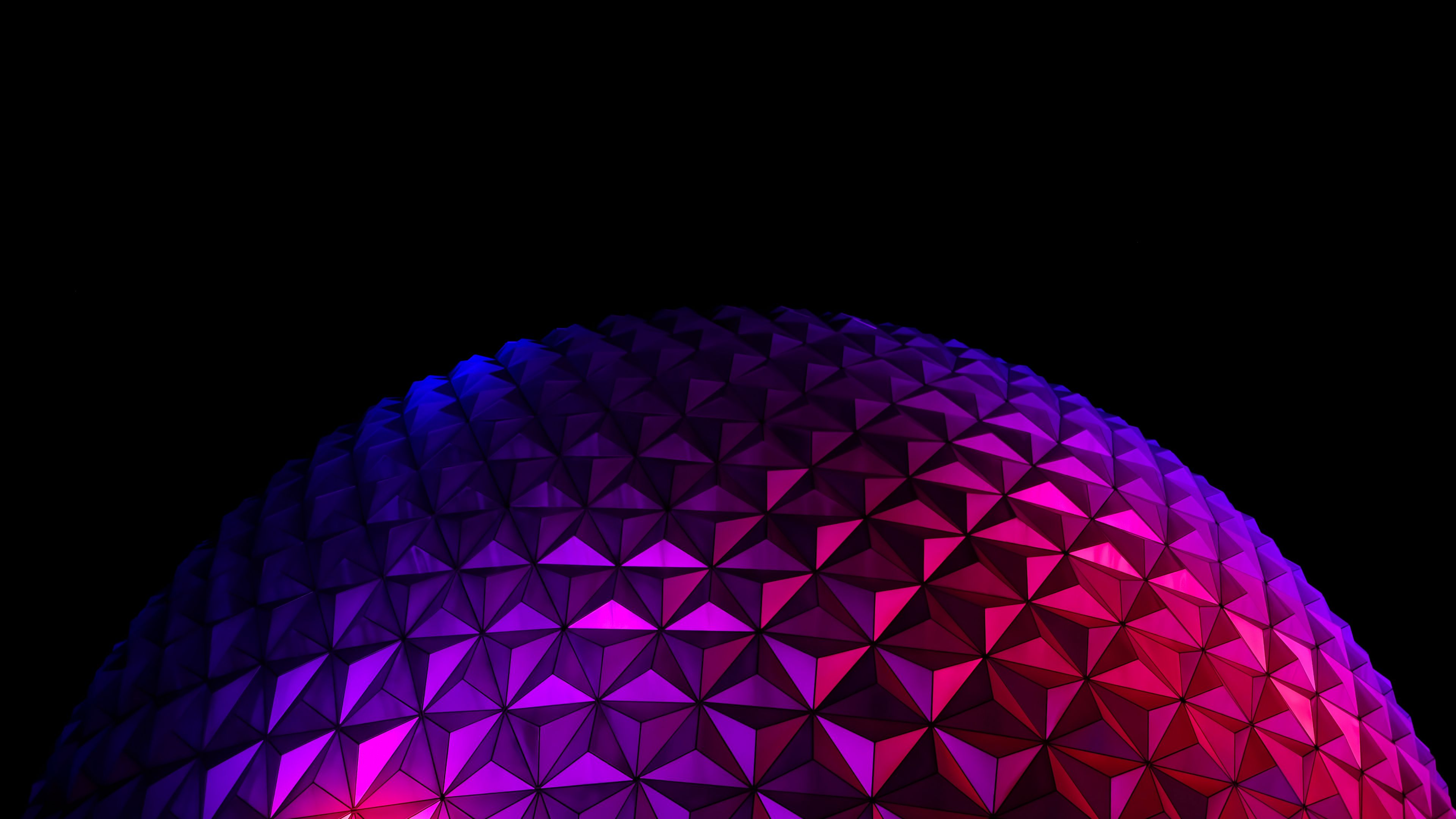 Description: A close up of a building with a red and purple dome on top of it's side and a black background.