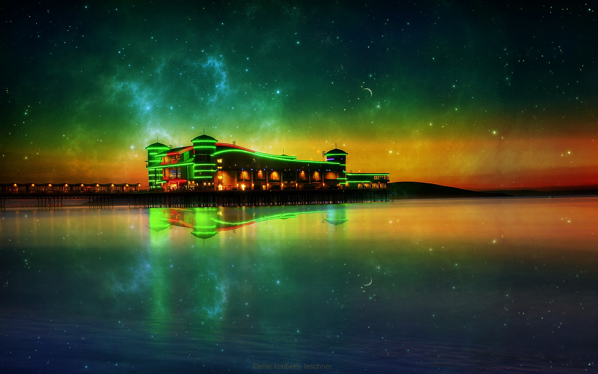 Description: A building with a green roof is lit up at night with a colorful sky and stars in the background.