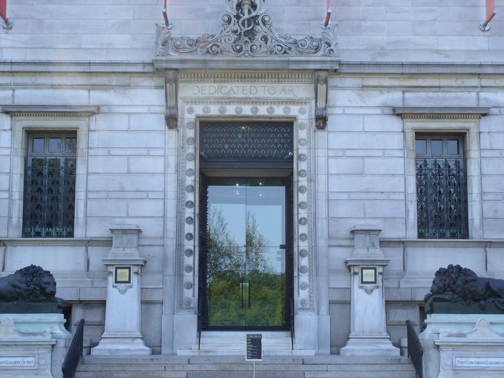 Description: A building with a large door and a clock on the front of it's face and windows with a clock on the front of the door.