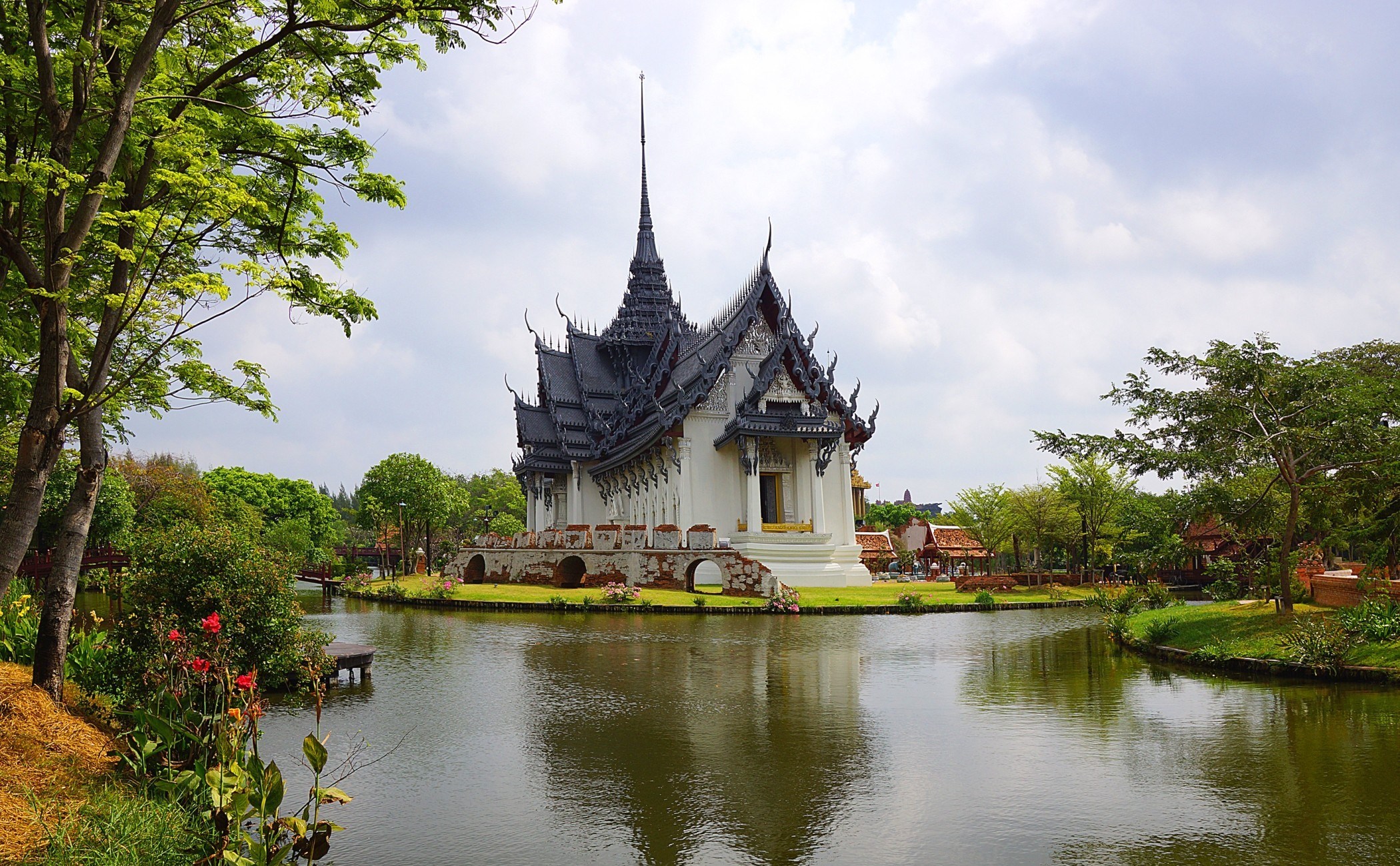 Description: A building with a pond in front of it and a sky background with clouds in the sky above it.