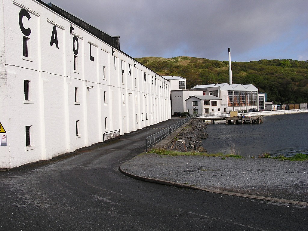 Description: A building with a sign on the side of it next to a body of water with a boat in the water.