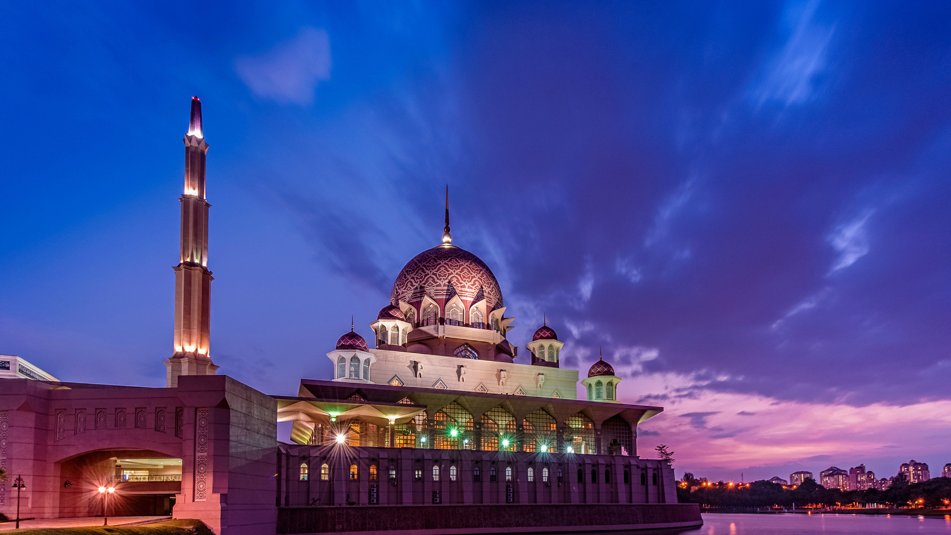 Description: A building with a tower and a clock on it at dusk with a body of water in the foreground.
