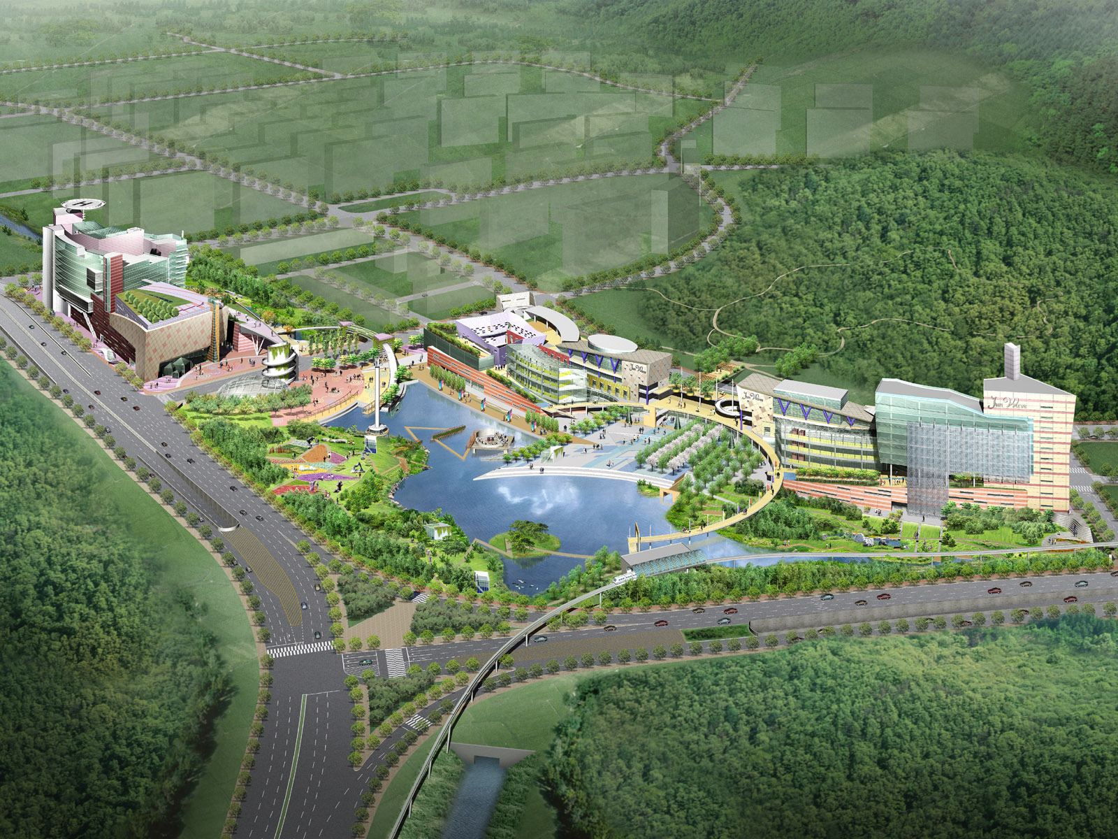 Description: A rendering of a large building surrounded by trees and a river in the middle of a road with a bridge.