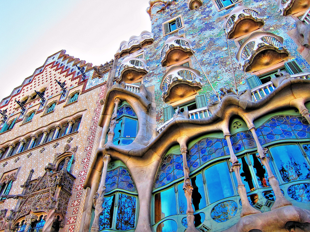 Description: A building with a lot of windows and a clock on the side of it's face and a sky background.