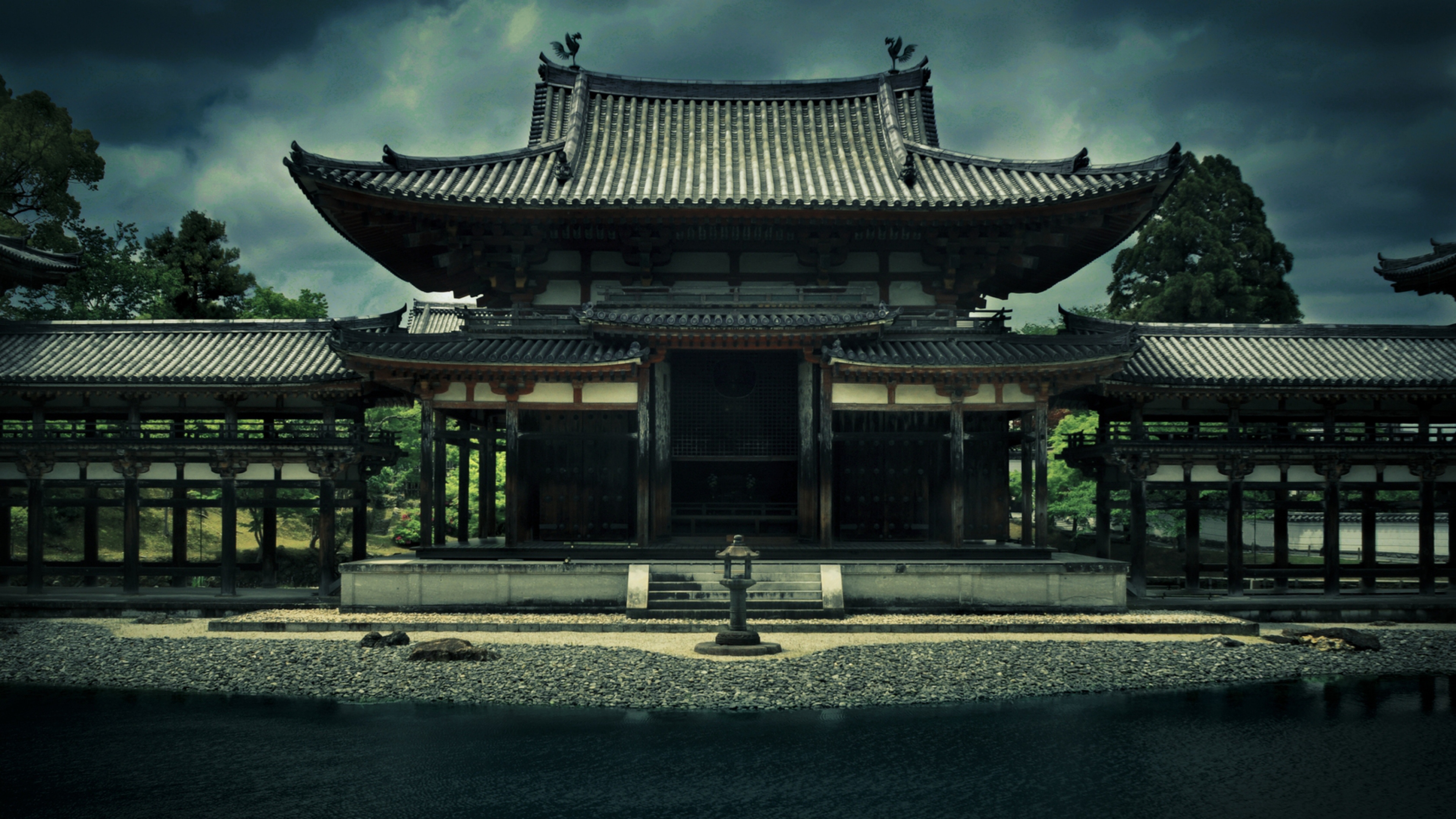 Description: A building with a lot of windows and a lot of trees in front of it and a body of water.