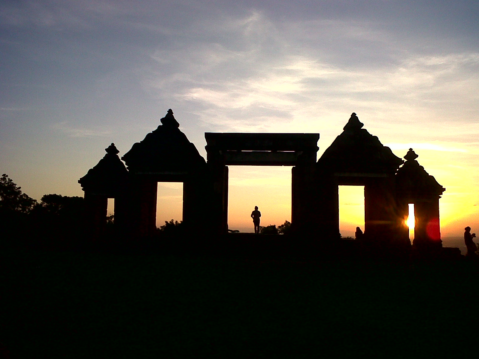 Description: A couple of buildings sitting in the middle of a field at sunset with the sun setting behind them and people standing in the distance.